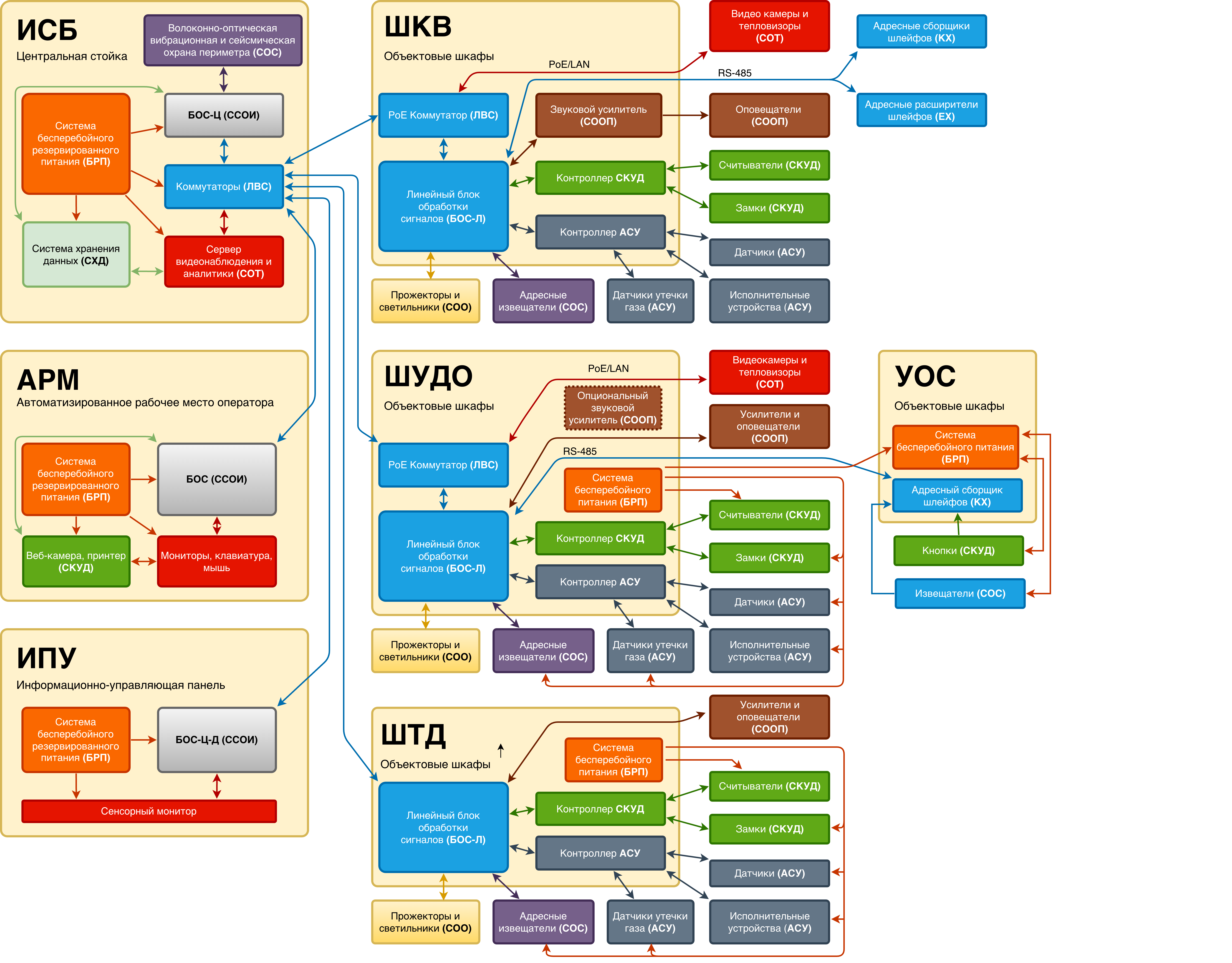 - Шкафы ШК обеспечивают сбор и обработки информации, внутренняя охрана, речевое оповещение, контроль и управление доступом, видеонаблюдение) внутри помещений;
