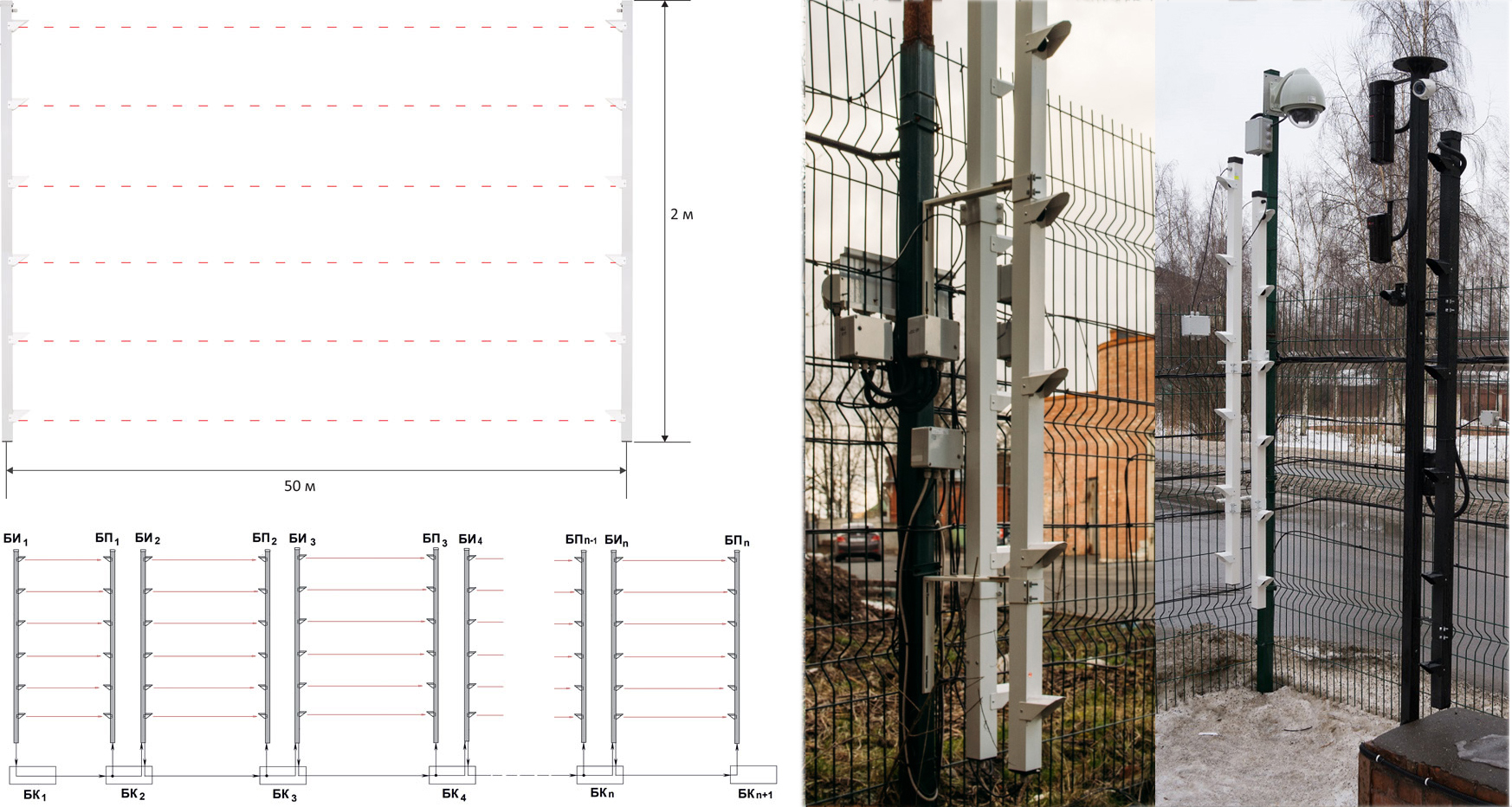 | Монолитное ограждение (бетон, кирпич). Есть второй уровень ограждения (колючая лента, сминаемый козырек). Есть полоса отчуждения | Вибрационная система (БОС-ВО, БОС-Ц, БОС-1) на втором уровне + пассивные ИК датчики (ИД) + противоподкоп (БОС-ВО, БОС-1) |