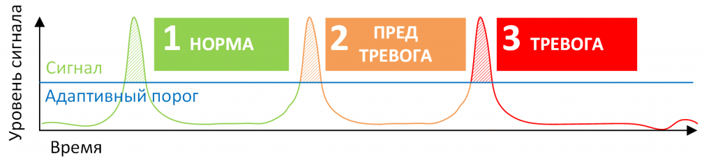 • подсчёт количества превышений сигналом адаптивного порогового уровня позволяет отличить случайные однократные воздействия (например, удар животного по ограждению) от реального преодоления ограждения, для которого, как правило, необходимо минимум три касания (взяться, подтянуться, перепрыгнуть);